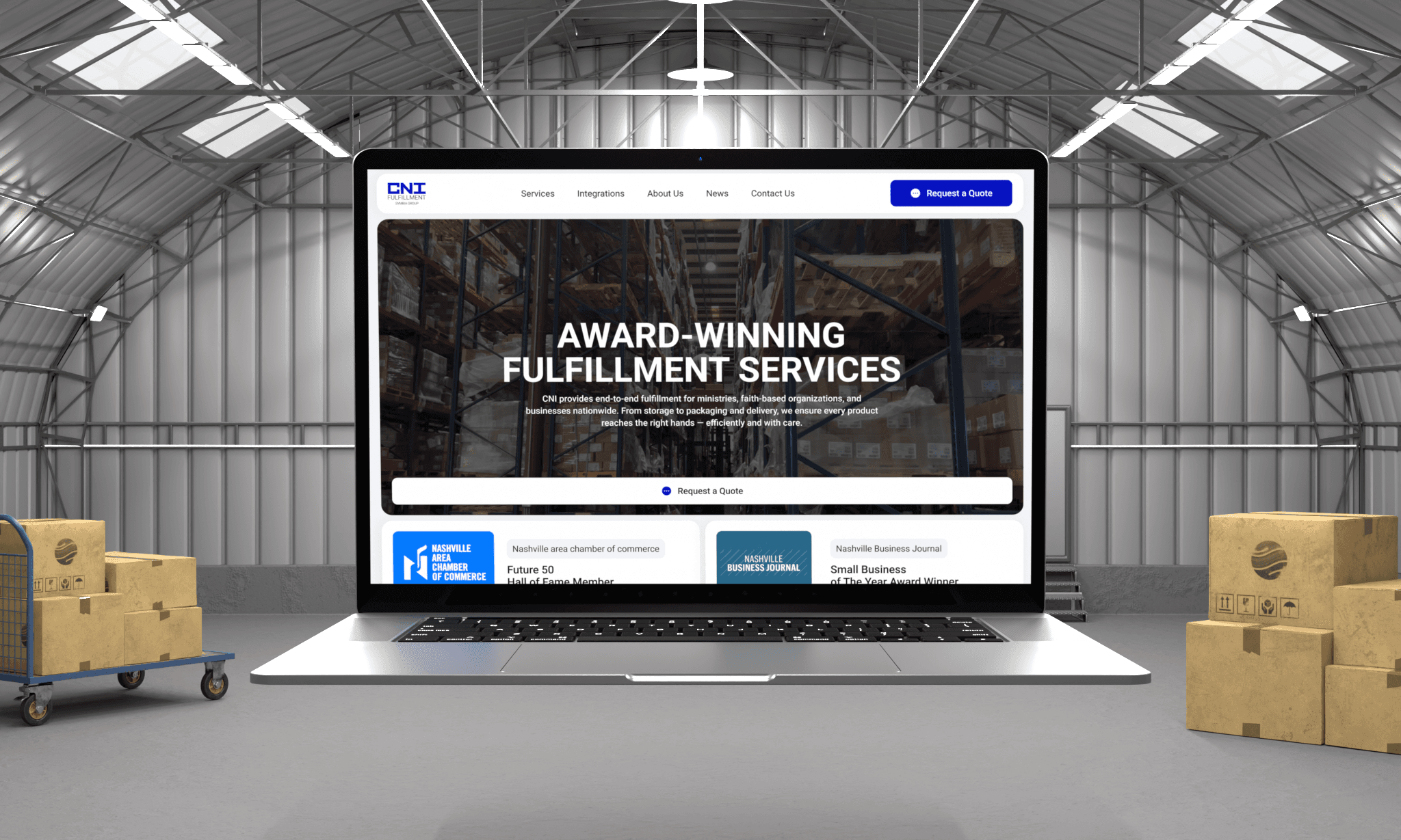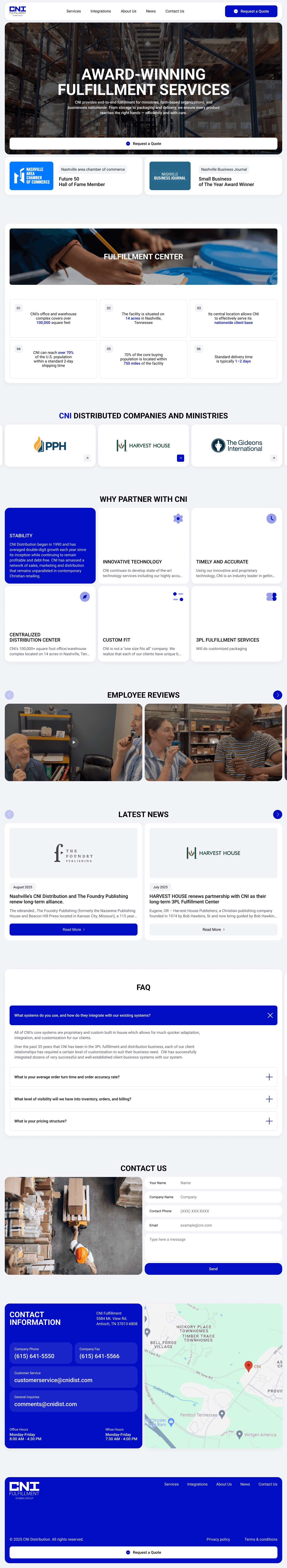 We developed a full-cycle website for CNI Fulfillment – a nationwide logistics and distribution company. The goal was to create a clear, trustworthy, and conversion-focused platform that highlights CNI’s award-winning services, long-term partnerships, and technology-driven approach. The site features structured service pages, integration capabilities, recognitions, and a streamlined request-a-quote system. Both desktop and mobile versions were designed for efficiency, clarity, and ease of navigation.