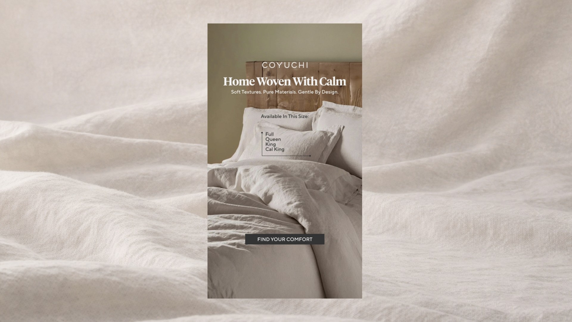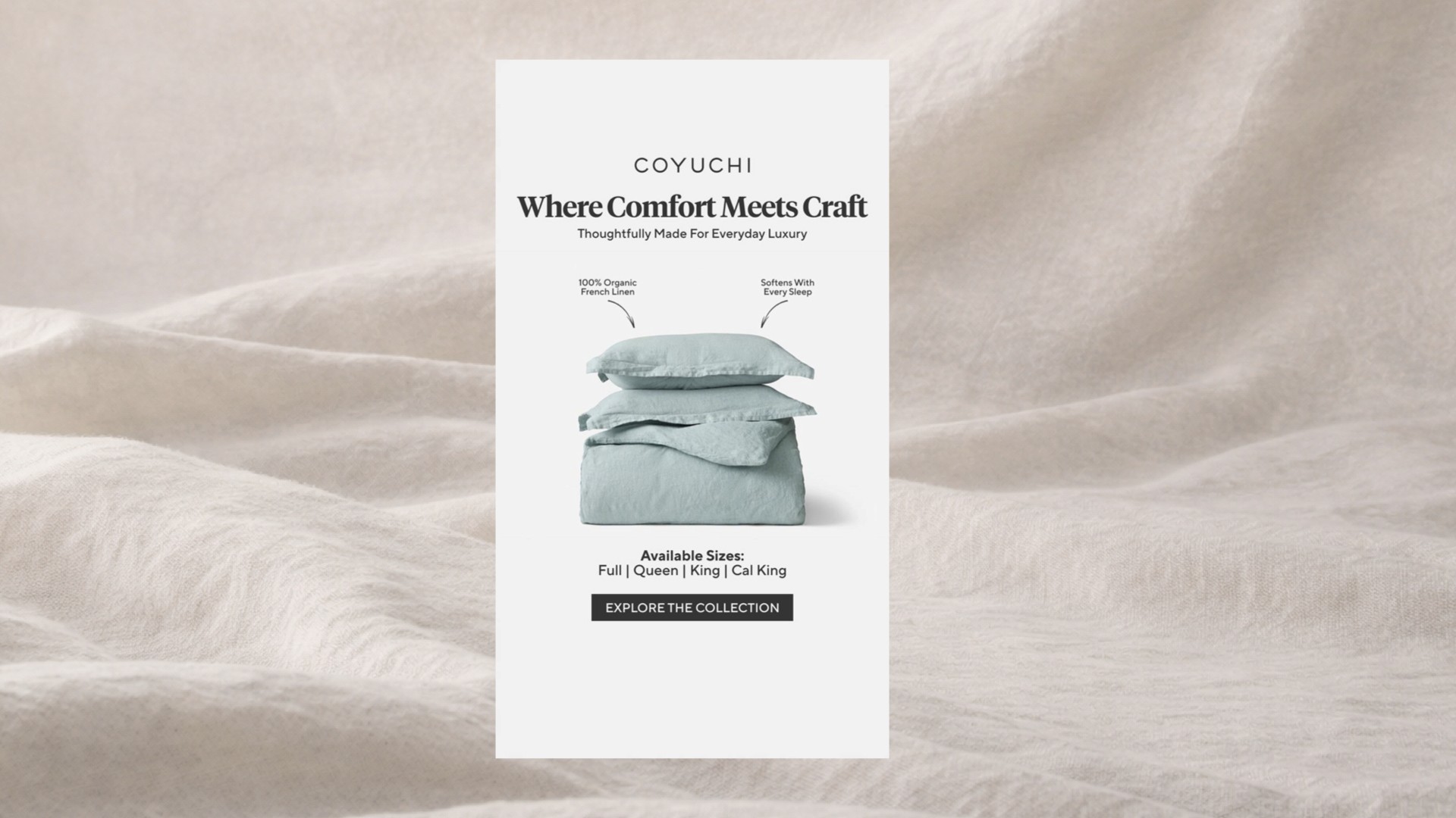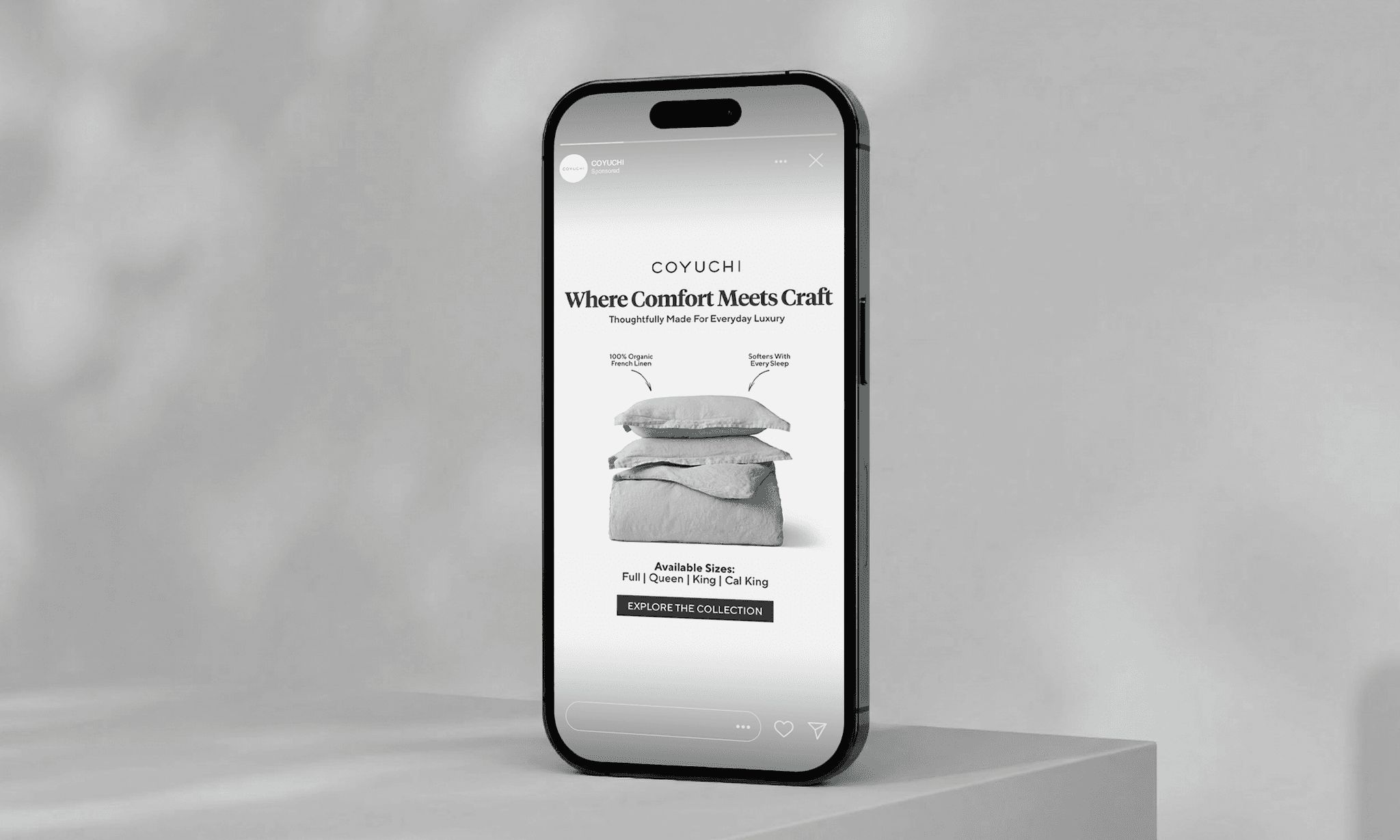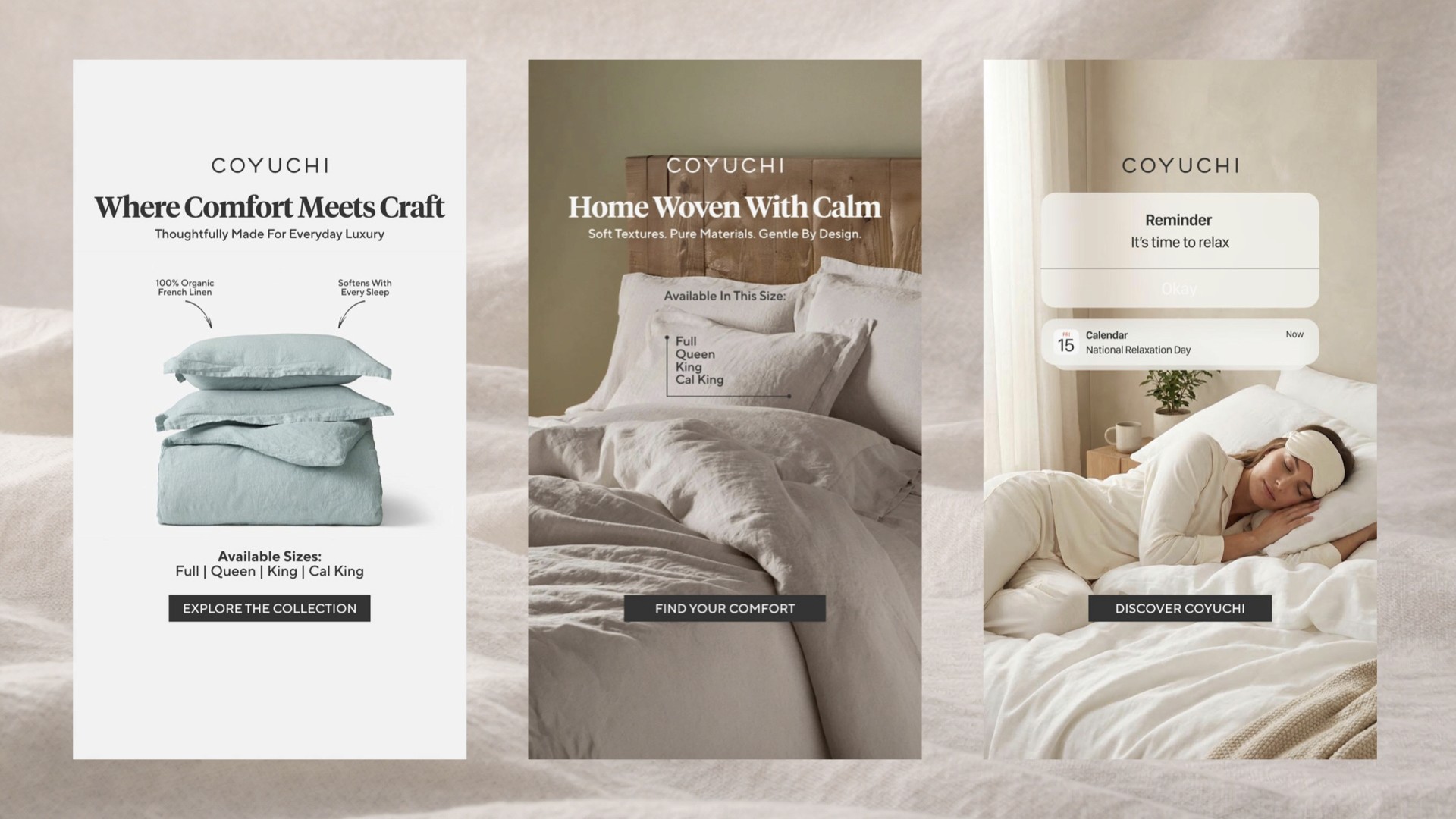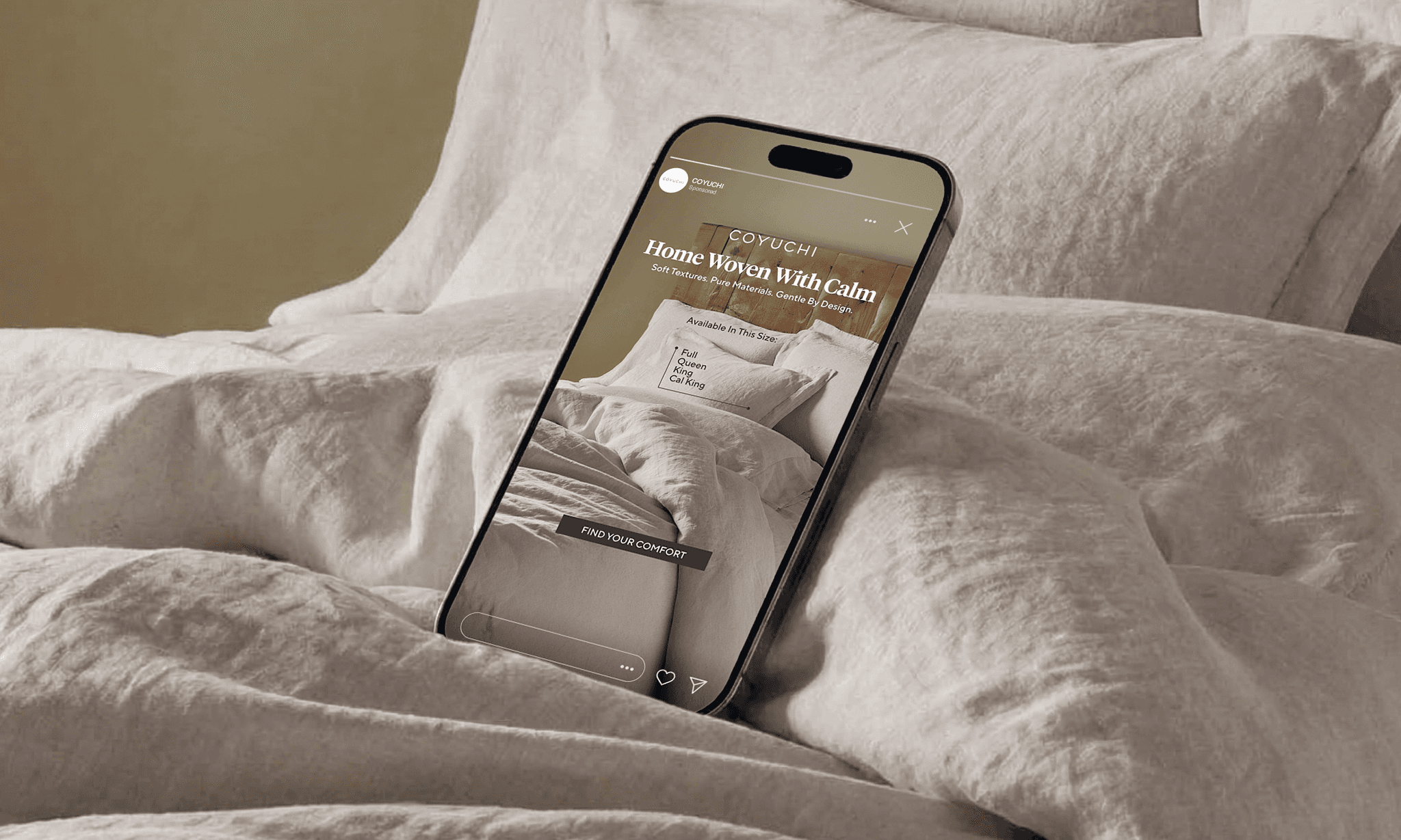 We created a set of Stories creatives for Coyuchi, including two static visuals and one motion piece, to increase brand awareness and drive traffic to the website. The concept focuses on natural comfort, premium quality, and a calm, minimal aesthetic. Each creative highlights the real product as the hero. Soft backgrounds, organic textures, and warm neutral tones emphasize material quality and create a sense of ease. The layout is clear and structured, guiding attention from product to message and then to the CTA. From a performance perspective, the creatives are built for fast consumption: clean composition, strong contrast, and concise messaging. The motion piece adds depth and atmosphere, helping the brand feel more alive and encouraging users to explore the collection.