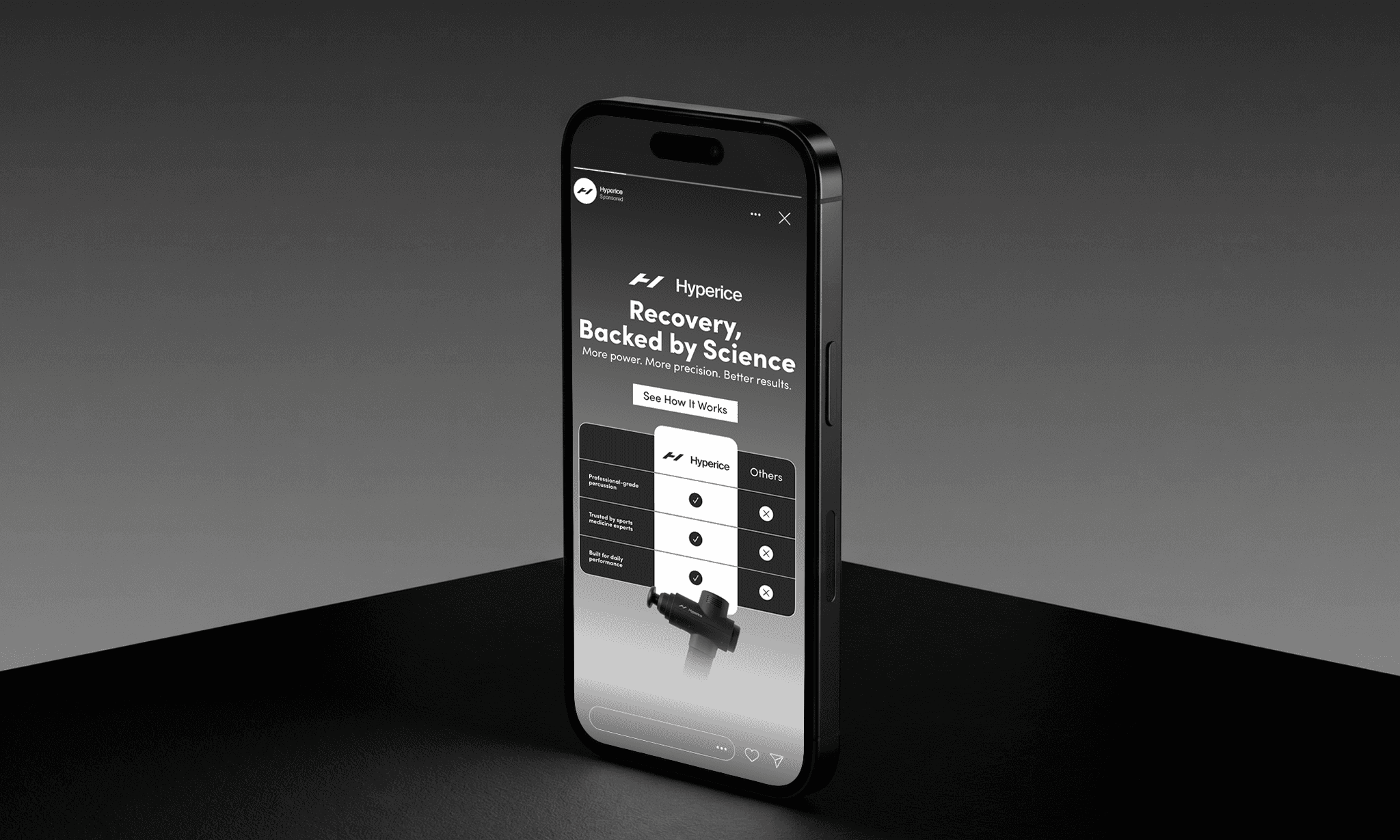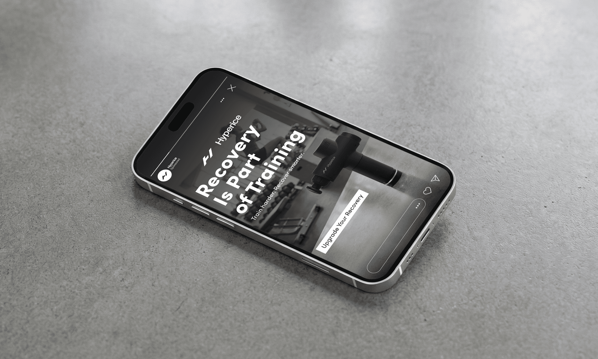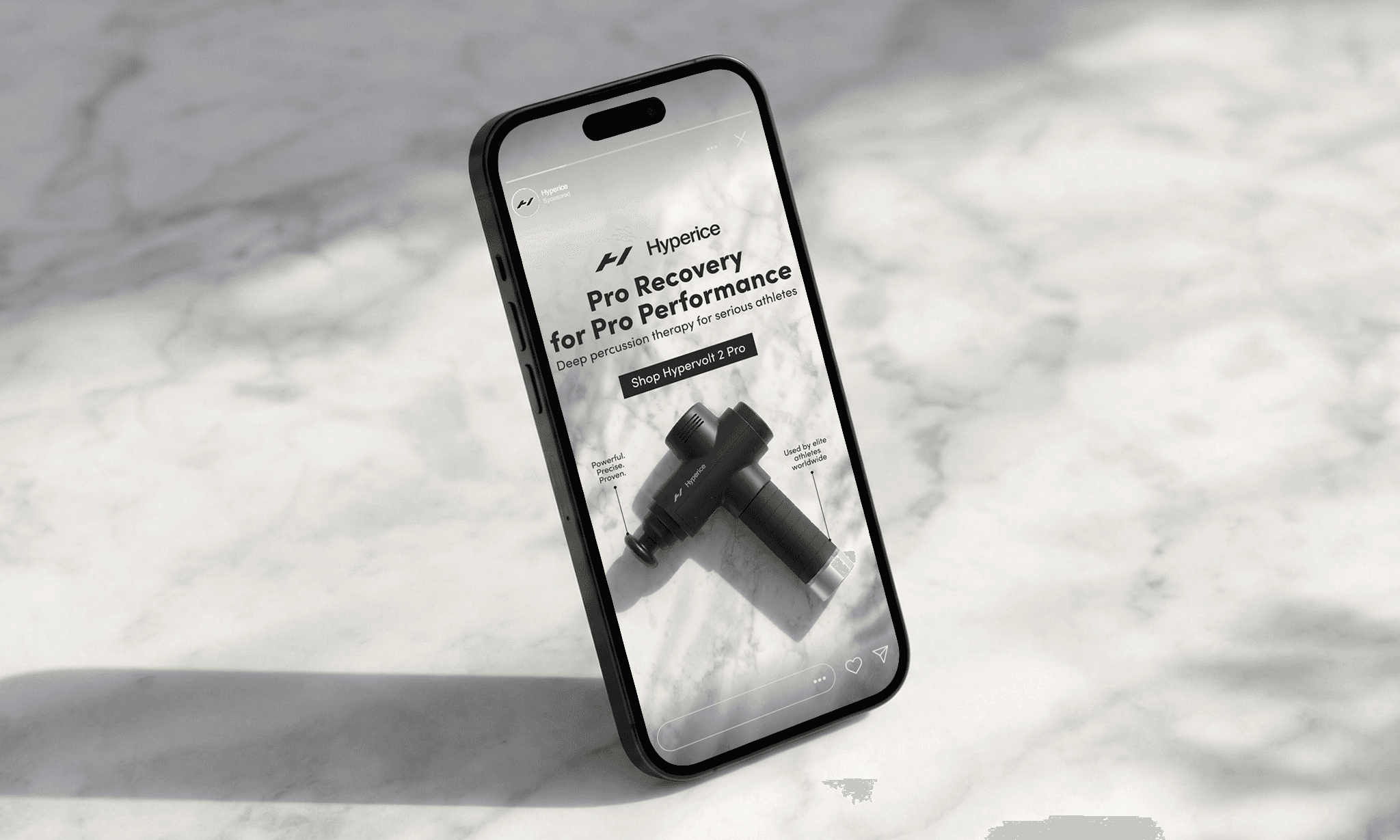 We designed a series of Instagram Stories creatives for Hyperice to increase brand awareness and highlight the brand’s professional recovery tools for athletes. Each creative focuses on the product as the hero, presented in a clean, premium environment inspired by sport and performance. Minimal backgrounds, natural textures, and controlled lighting emphasize the device’s form and technical design while keeping the composition clear and focused. The visual structure guides the viewer naturally: product → headline → CTA. Headlines communicate performance and recovery benefits, while short supporting lines add credibility with references to professional athletes and sports science. Strong contrast, clear spacing, and a focused layout help the product stand out in the fast-moving Stories format. The result is a set of functional yet premium creatives designed to capture attention, communicate value quickly, and invite users to explore Hyperice products on the website.