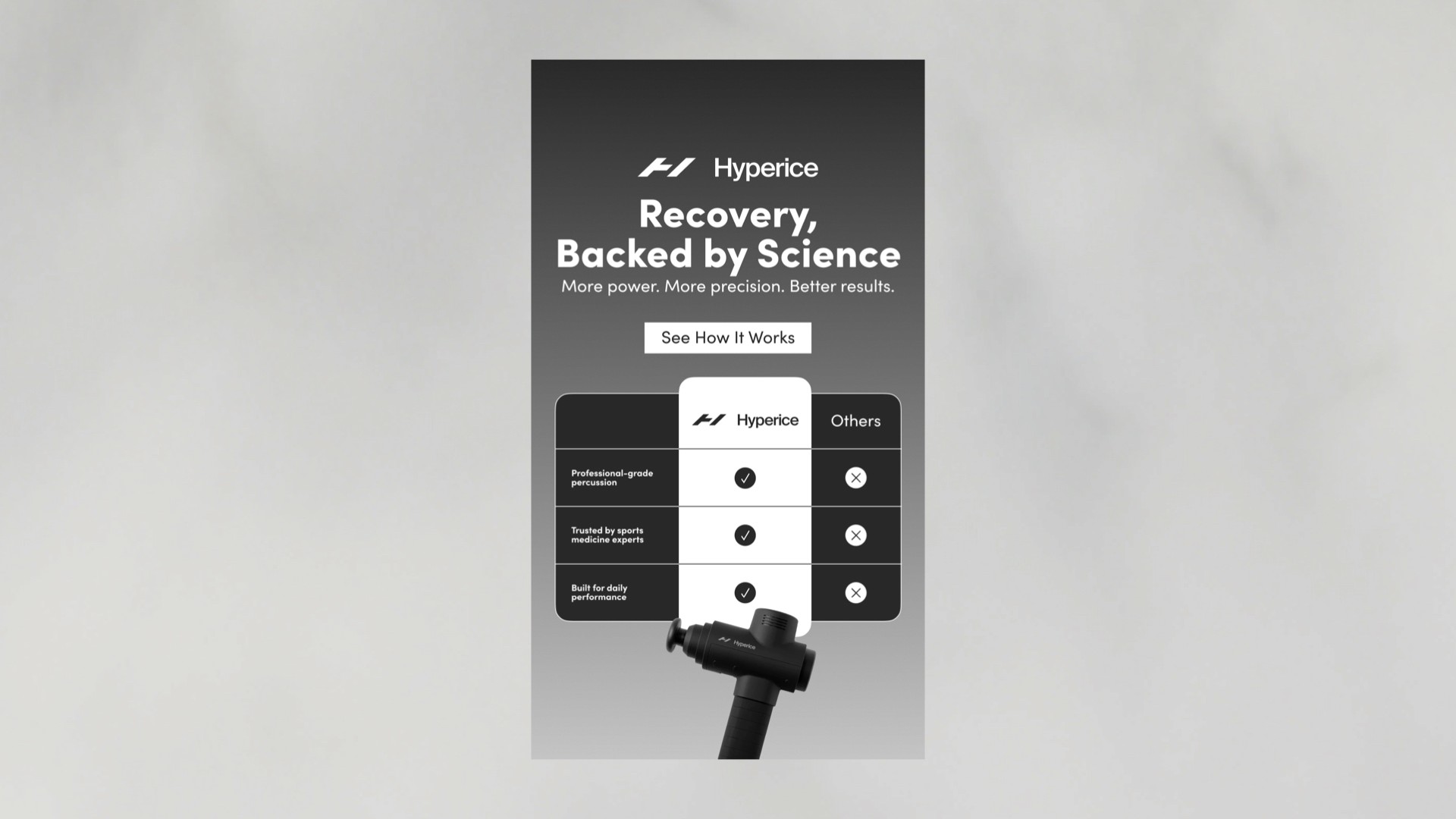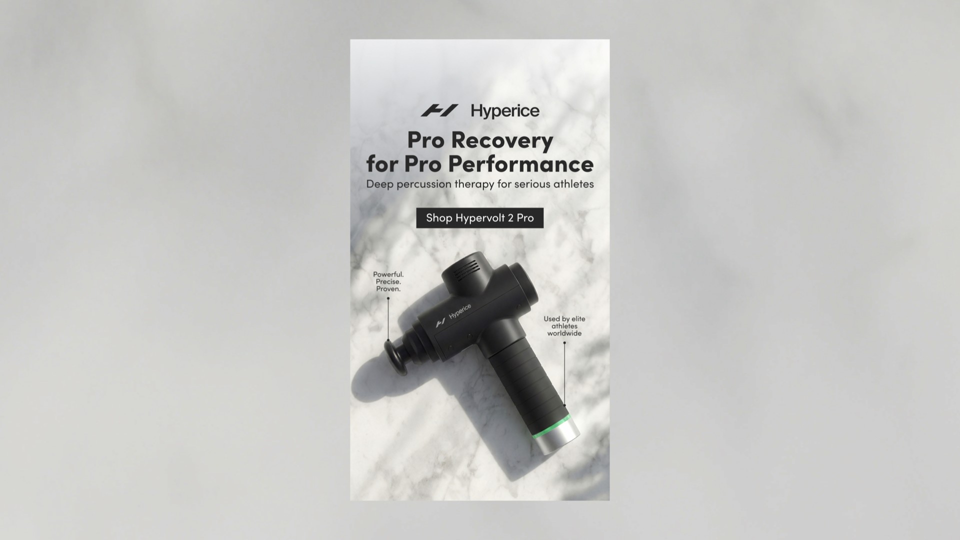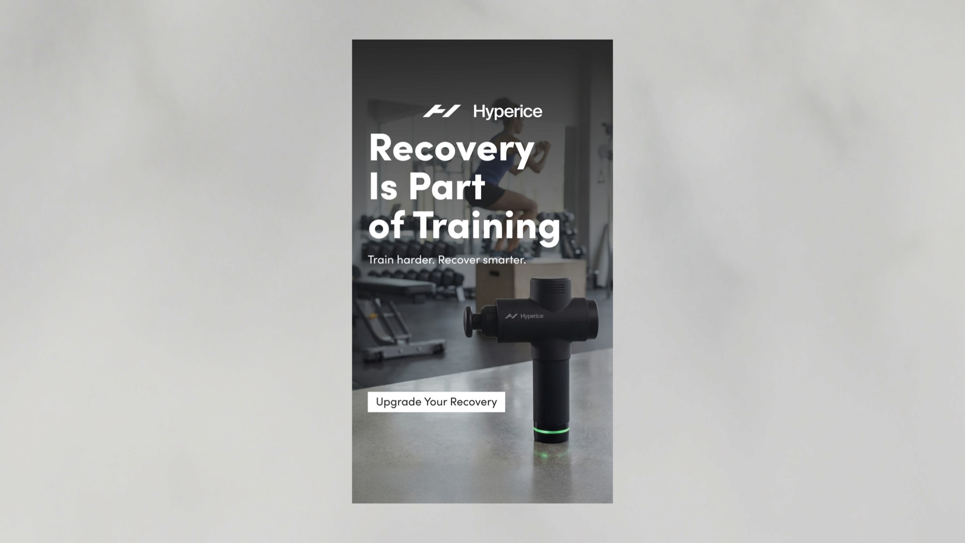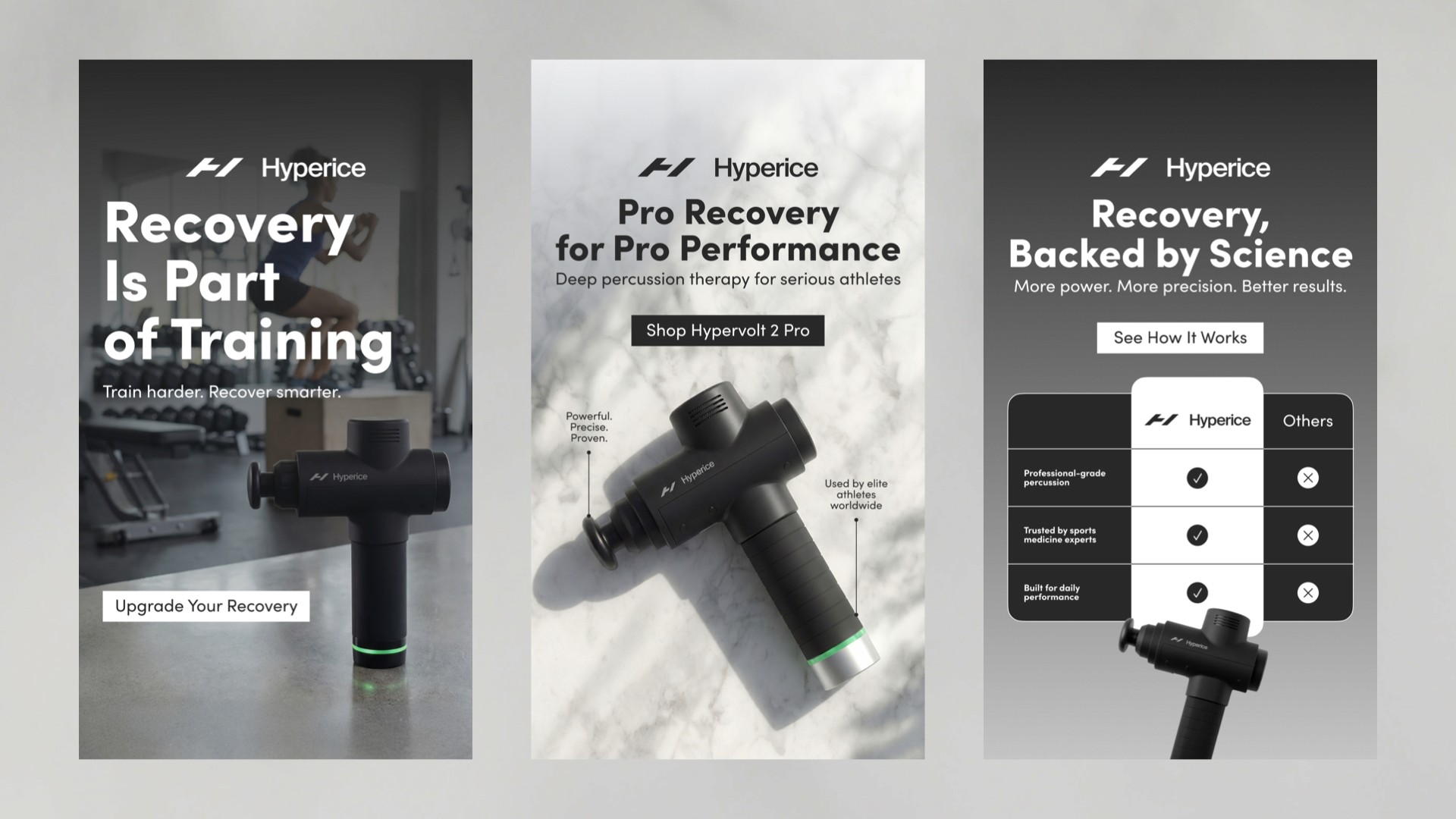 We designed a series of Instagram Stories creatives for Hyperice to increase brand awareness and highlight the brand’s professional recovery tools for athletes. Each creative focuses on the product as the hero, presented in a clean, premium environment inspired by sport and performance. Minimal backgrounds, natural textures, and controlled lighting emphasize the device’s form and technical design while keeping the composition clear and focused. The visual structure guides the viewer naturally: product → headline → CTA. Headlines communicate performance and recovery benefits, while short supporting lines add credibility with references to professional athletes and sports science. Strong contrast, clear spacing, and a focused layout help the product stand out in the fast-moving Stories format. The result is a set of functional yet premium creatives designed to capture attention, communicate value quickly, and invite users to explore Hyperice products on the website.