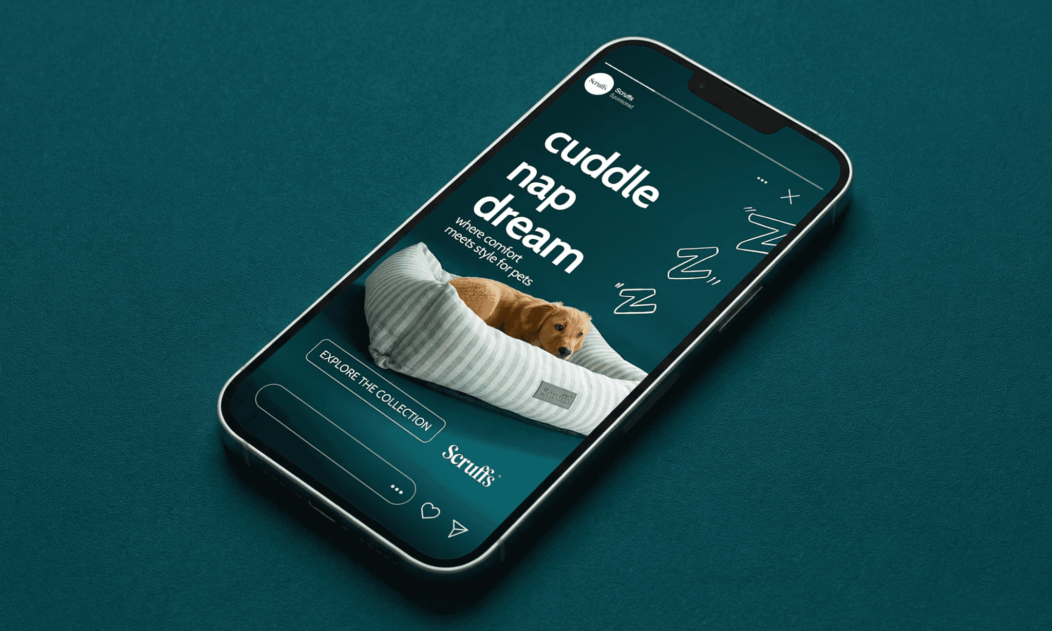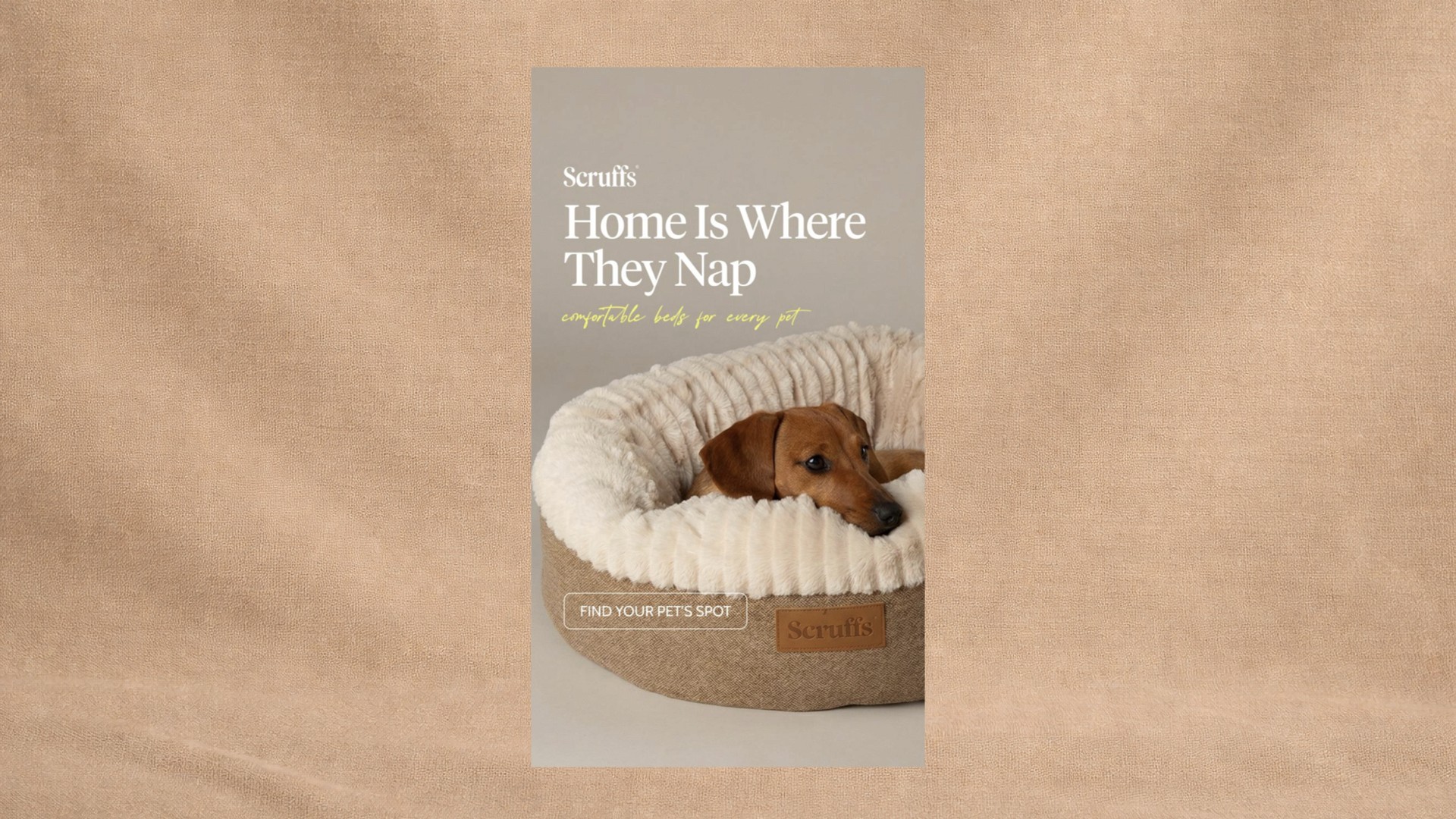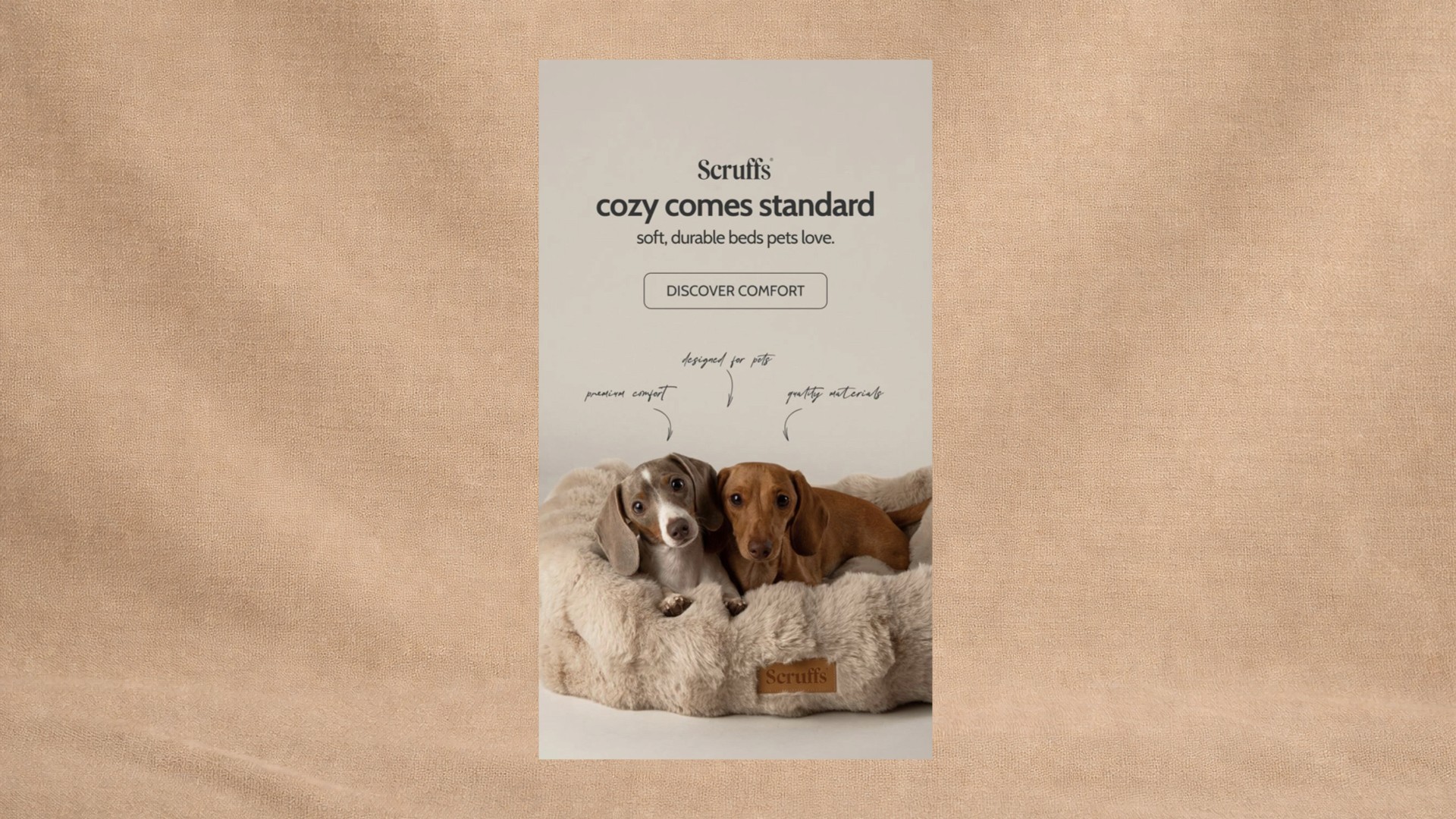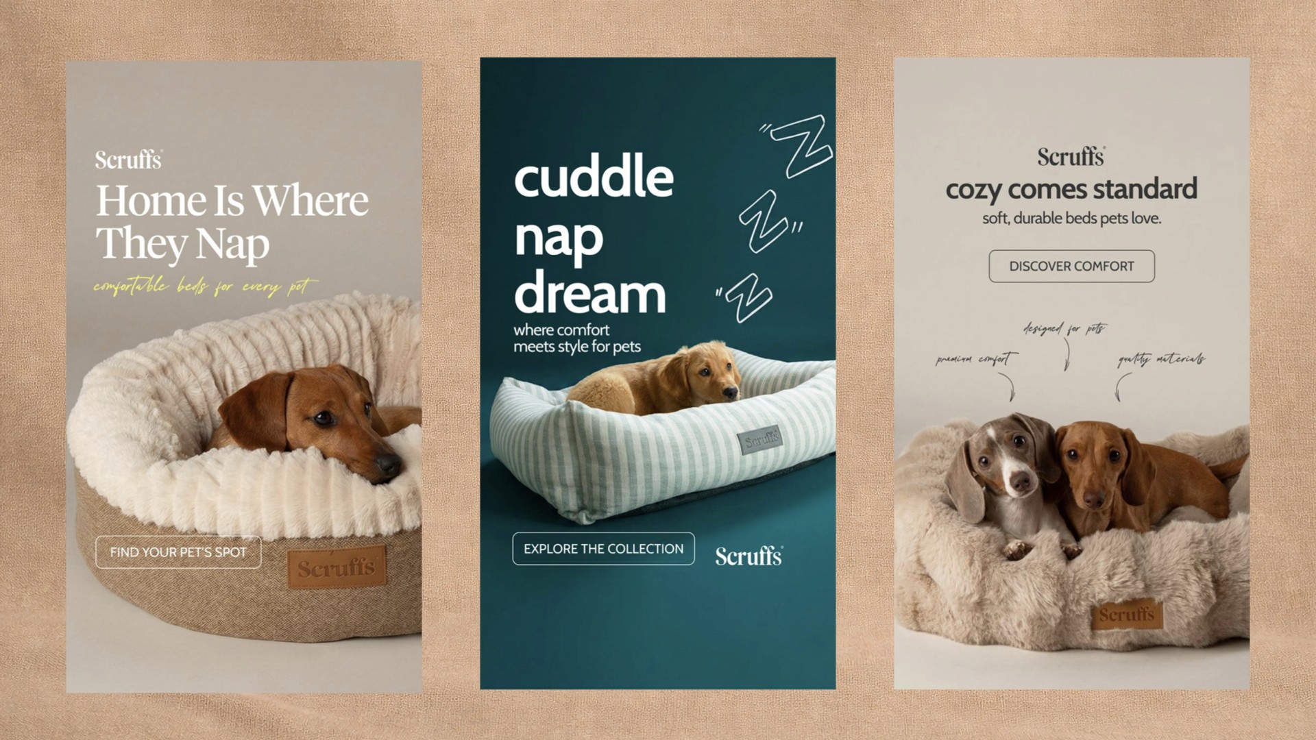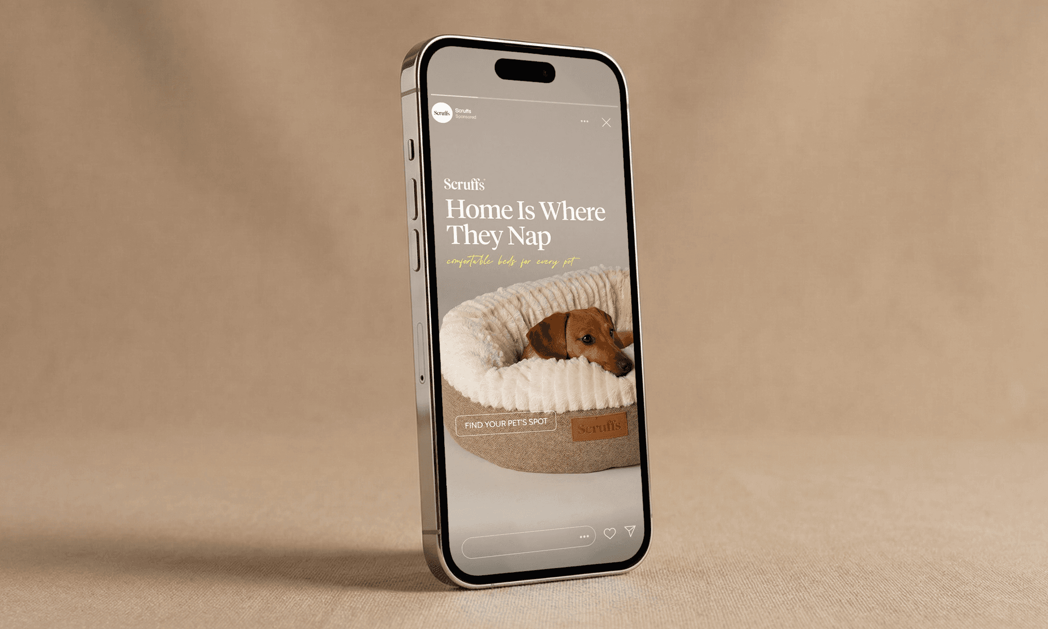 We developed a series of Instagram/Facebook story creatives for PetsLoveScruffs with a focus on fast product understanding and brand positioning. Each creative is built around a single message–comfort, care, and everyday coziness. Headlines are short and clear, designed to be read in seconds and immediately communicate the benefit. The visual system is clean and consistent: warm color palette, soft textures, and minimal backgrounds that don’t compete with the product. The bed is always the hero. Composition and contrast are used to highlight materials, depth, and comfort. Real pet imagery reinforces trust and shows the product in use. This approach makes the creatives easy to scan, visually appealing, and effective in ads. The result is a premium look with a clear message–helping the brand stand out and making the product value obvious at first glance.